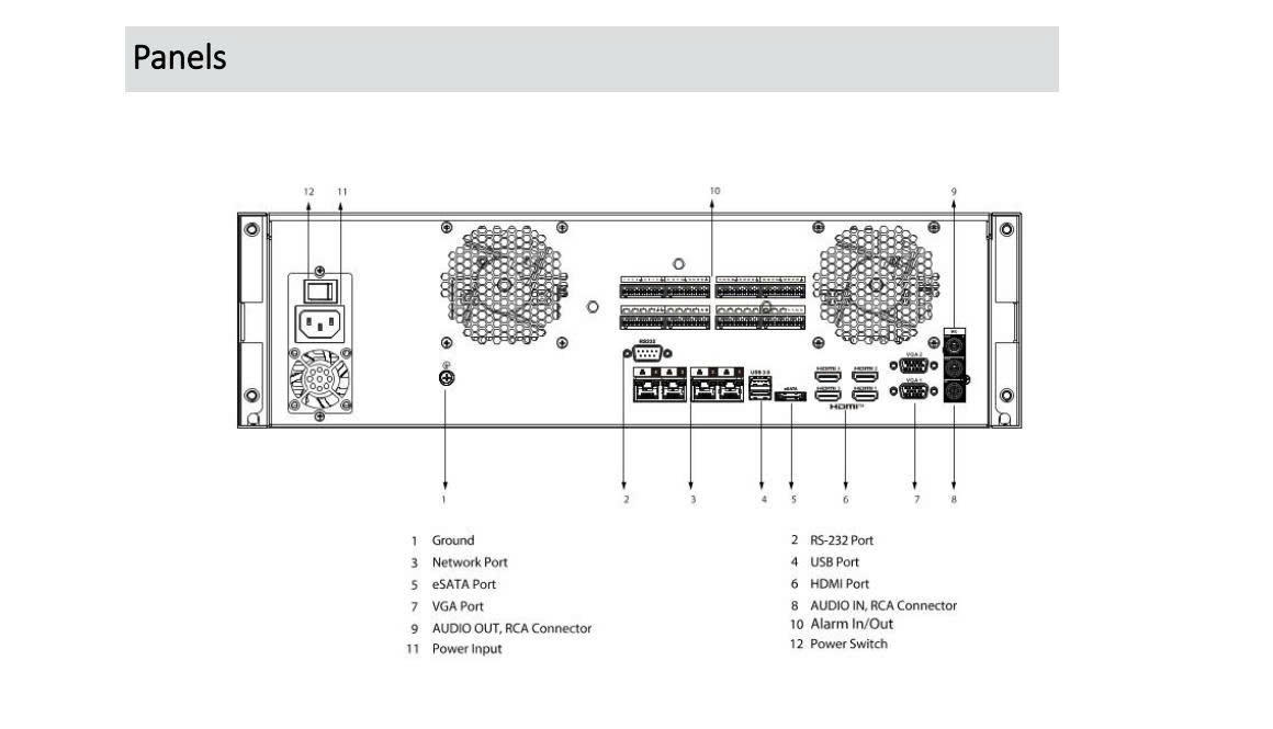 ■ Hỗ trợ 16 ổ cứng mỗi ổ 20TB, 1 cổng esata, usb hỗ trợ 4 cổng , 2 cổng RJ45(10/100/1000M), 1 cổng RS232, 4 cổng HDMI, 2 cổng VGA