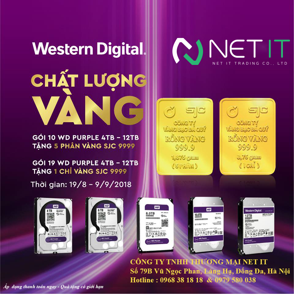 - Gói 19 chiếc Ổ cứng tím Western Digital dung lượng từ 4TB đến 12TB được tặng ngay 1 chỉ vàng SJC 9999